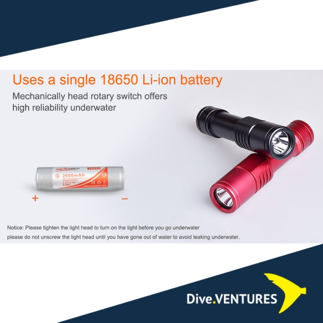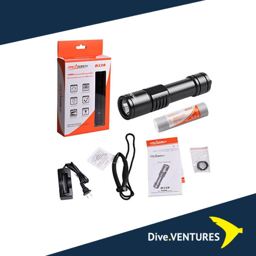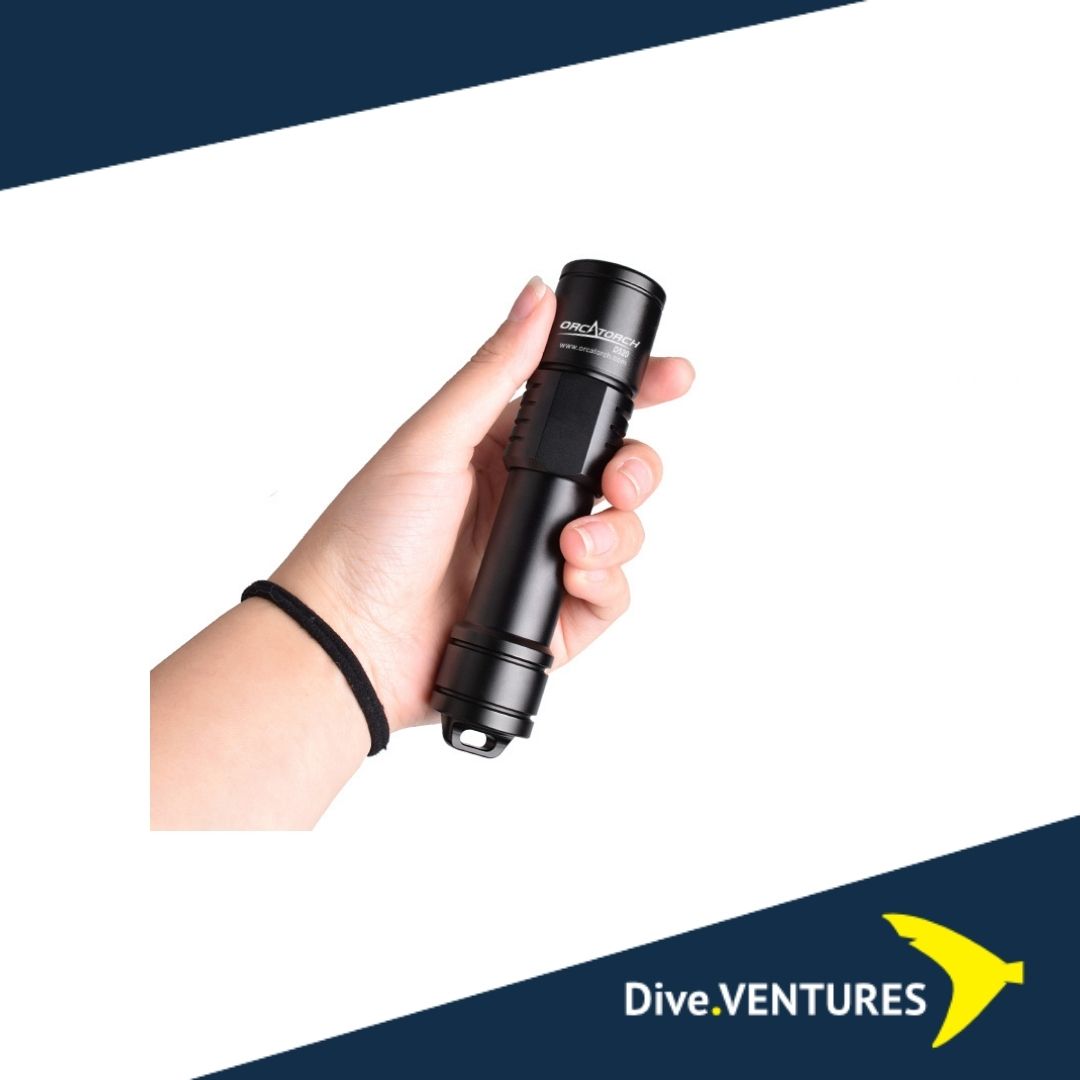 OrcaTorch D520 is a palm-sized diving light with a mechanically rotary switch. The rotary switch offers high reliability underwater. Using the USA CREE XM-L2(U4) neutral white LED, its max output can reach 1000 lumens, meanwhile the 5000K LED color temperature provides superb color rendition. Powered by one 18650 battery, its max runtime can reach 2 hours.