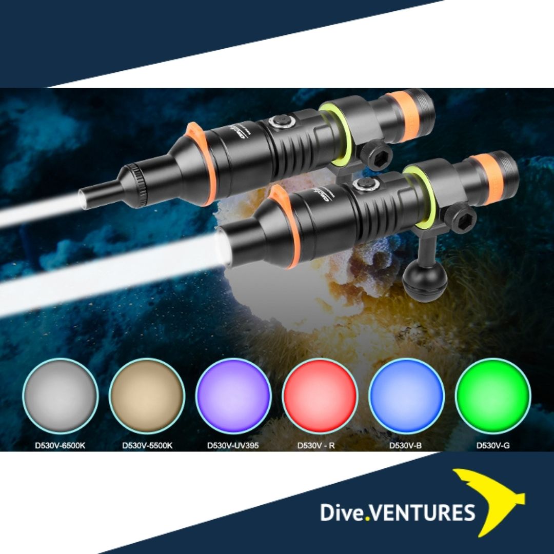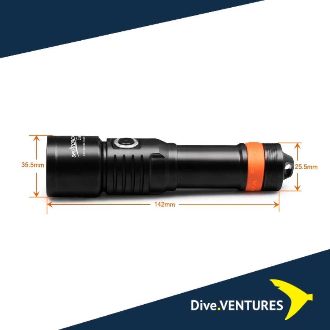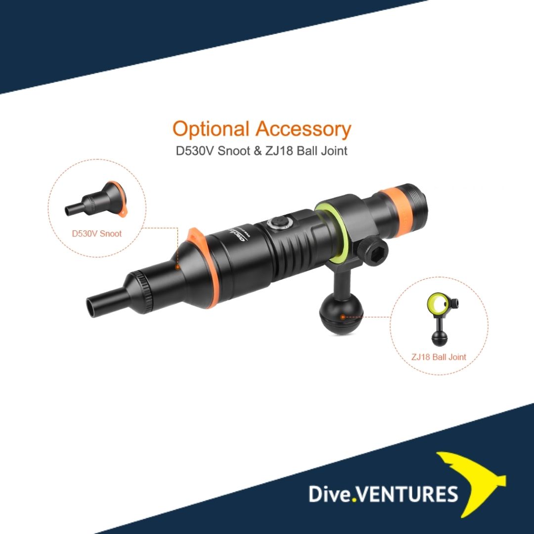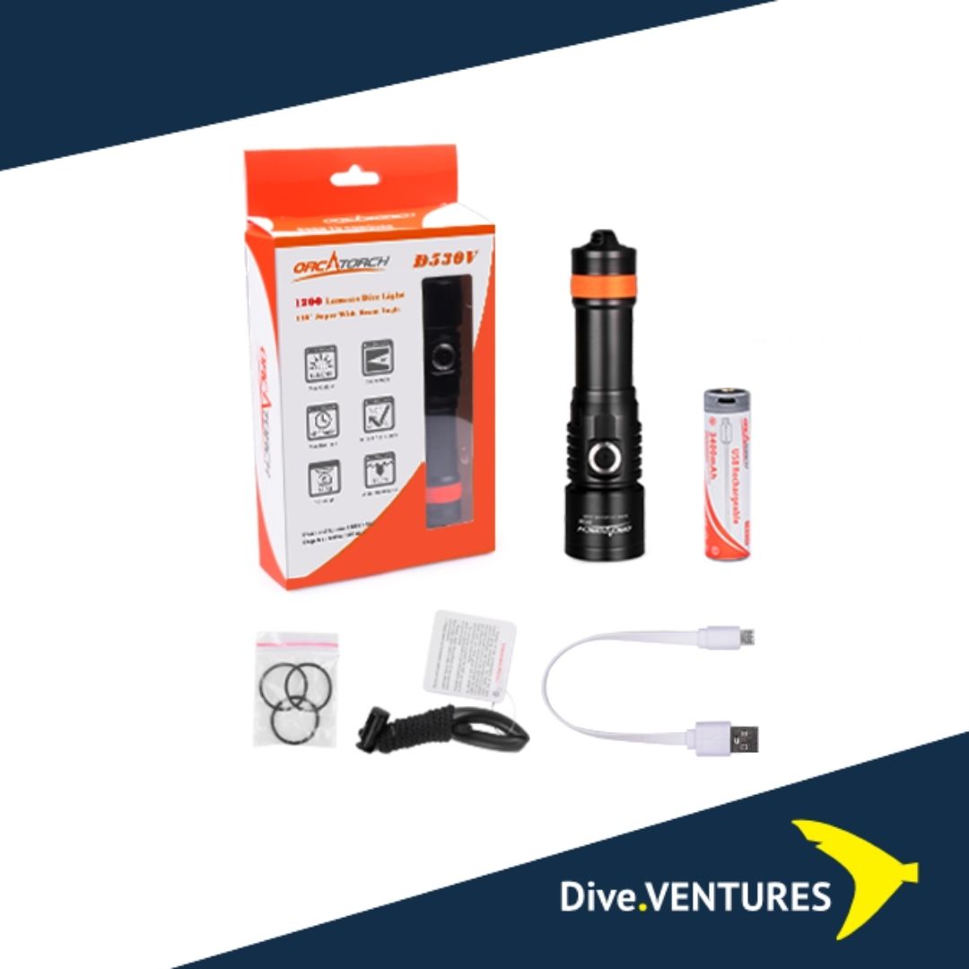 ORCATORCH D530V is a professional underwater video light with Max 1200 lumens output. It has 120 degrees super wide floodlighting with no blind angle for underwater photography. The light uses a titanium alloy side switch that offers 2 lighting modes, which allows for easy operation underwater. The LED indicator light located on the switch button also lets you know the battery's remaining charge.