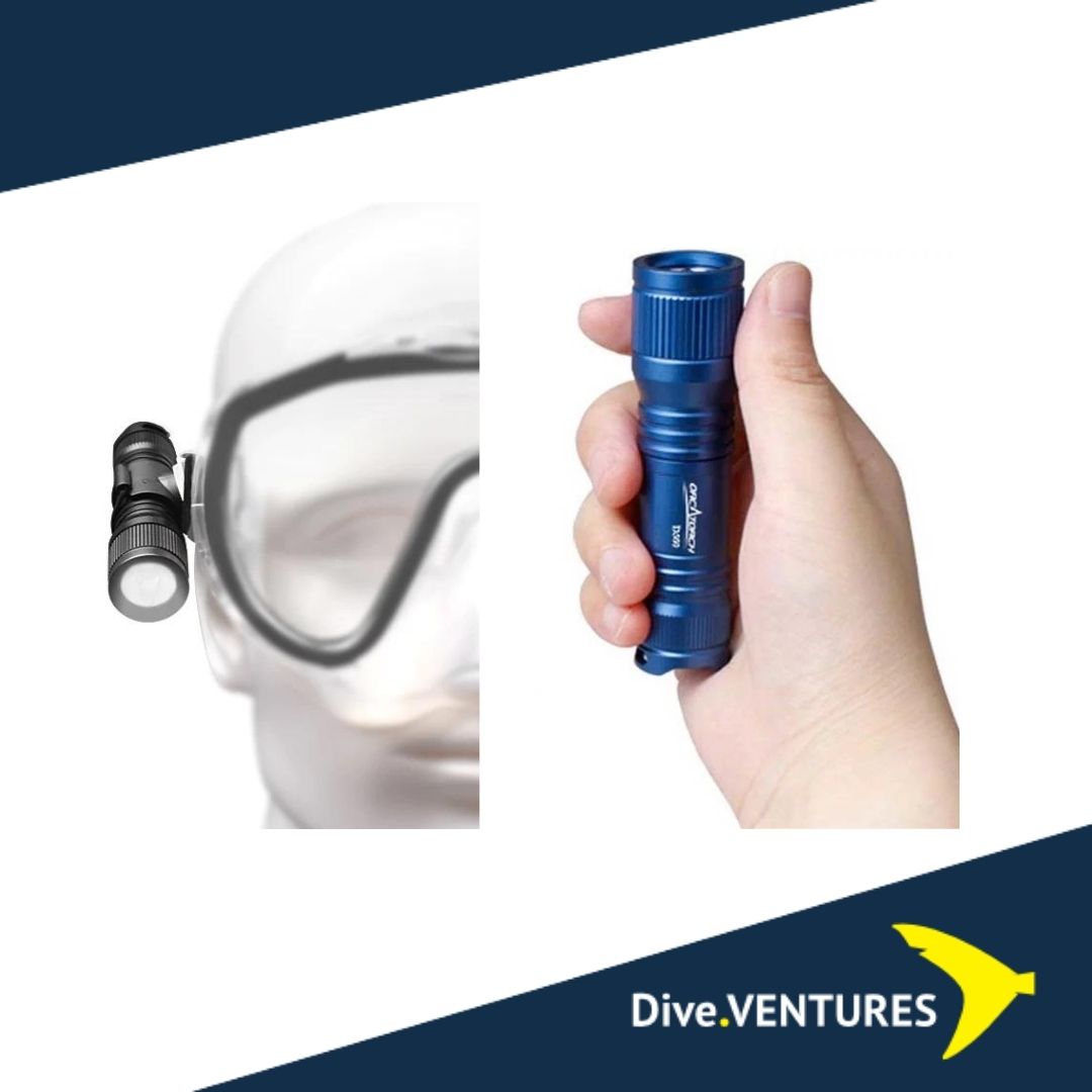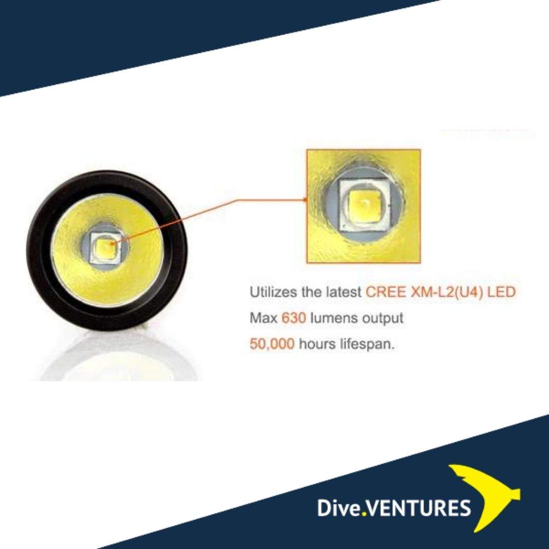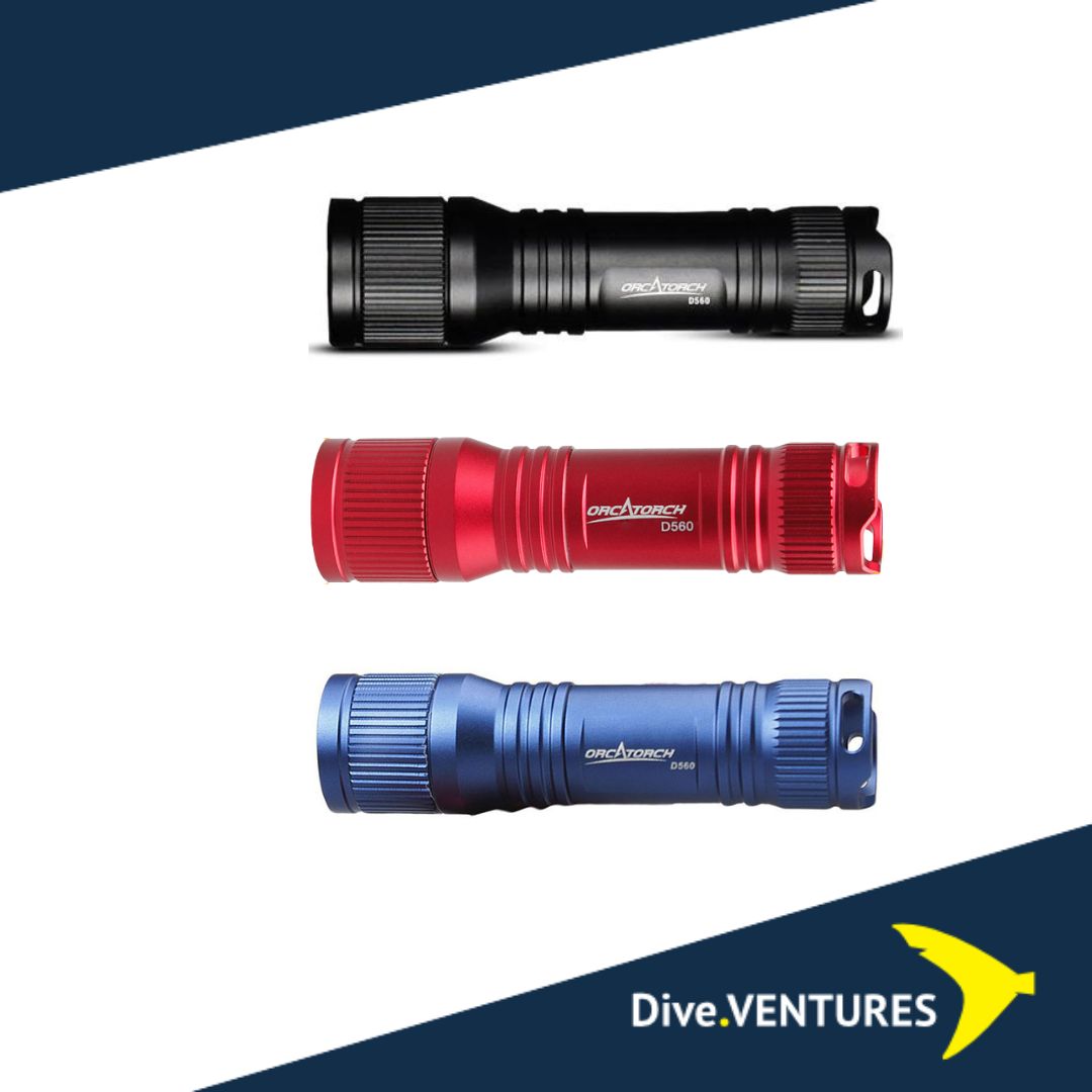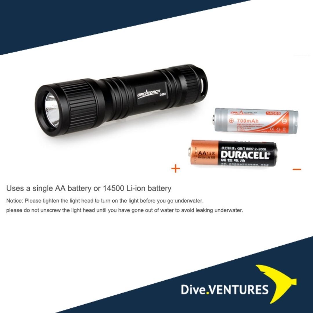 ORCATORCH D560 is a mini dive light with only 9 cm length. Its max output can reach 630 lumens by using a single 14500 battery, and the longest runtime is 1h25min by using one AA battery. The light can rotate 360°angle with Orcatorch MX05 mask mount.