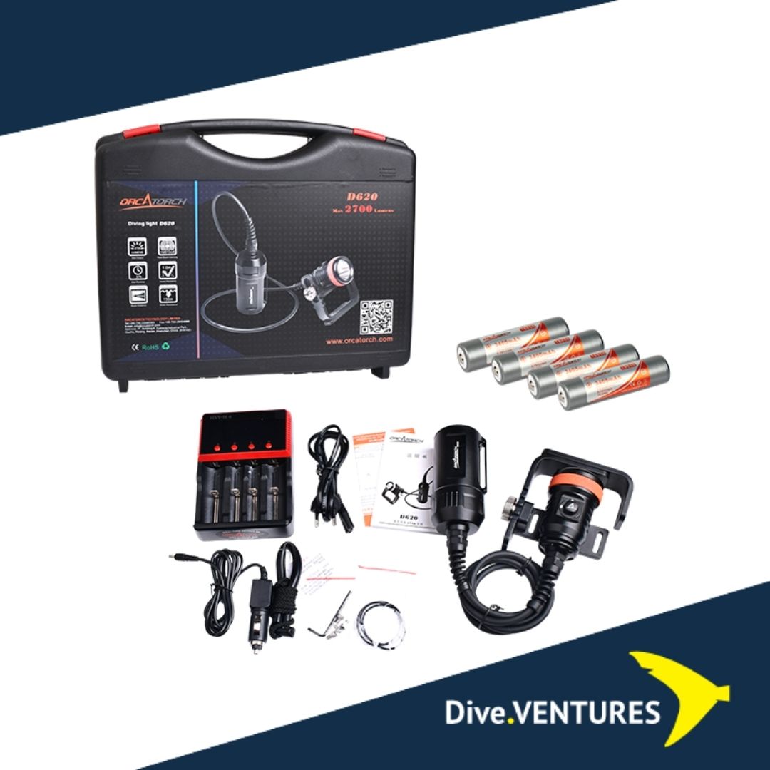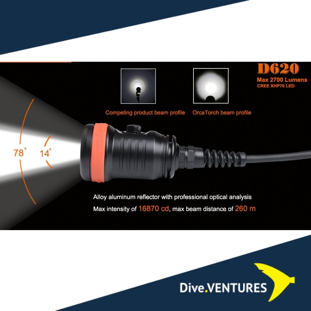 ORCATORCH D620 is a primary canister dive light specially designed for underwater adventure such as scuba diving and cave diving. The newly designed switch can be locked when rotated 90 degrees, which not only offers easy and reliable operation but also avoid turning on the light accidently.