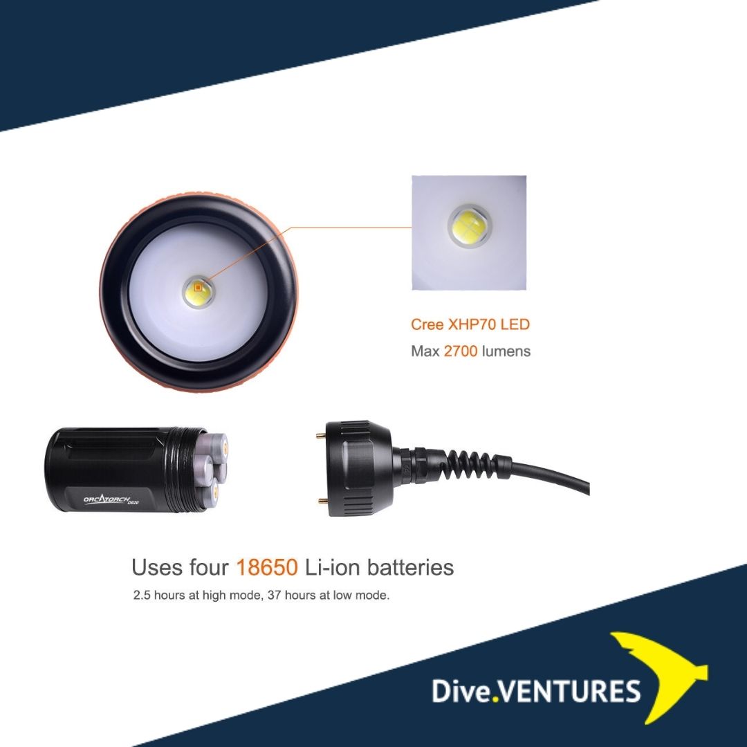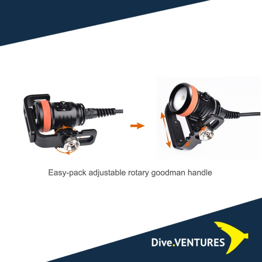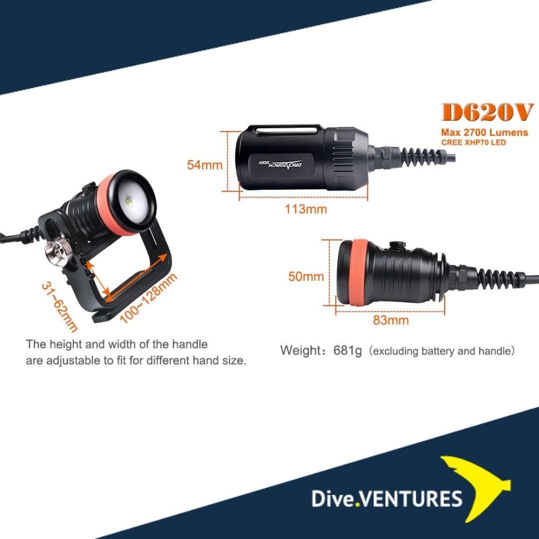 ORCATORCH D620V is a primary canister video light specially designed for underwater adventure such as scuba diving and cave diving. The newly designed switch can be locked when rotated 90 degrees, which not only offers easy and reliable operation but also avoid turning on the light accidently.