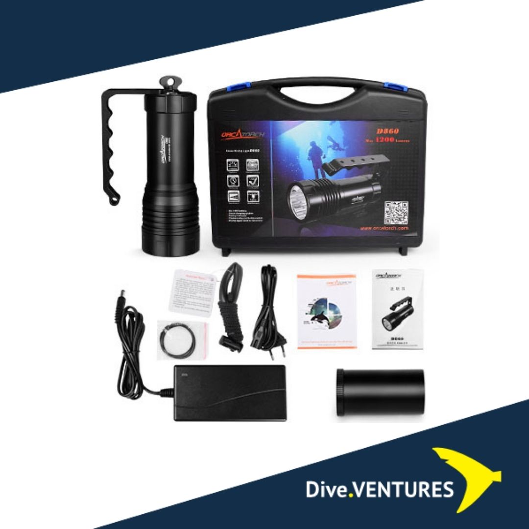 OrcaTorch D860 is a high performance dive light with direct charging function. Powered by three Cree LEDs, it can reach max 4200 lumens. With the direct charging function, the light can be charged without taking out the battery pack.